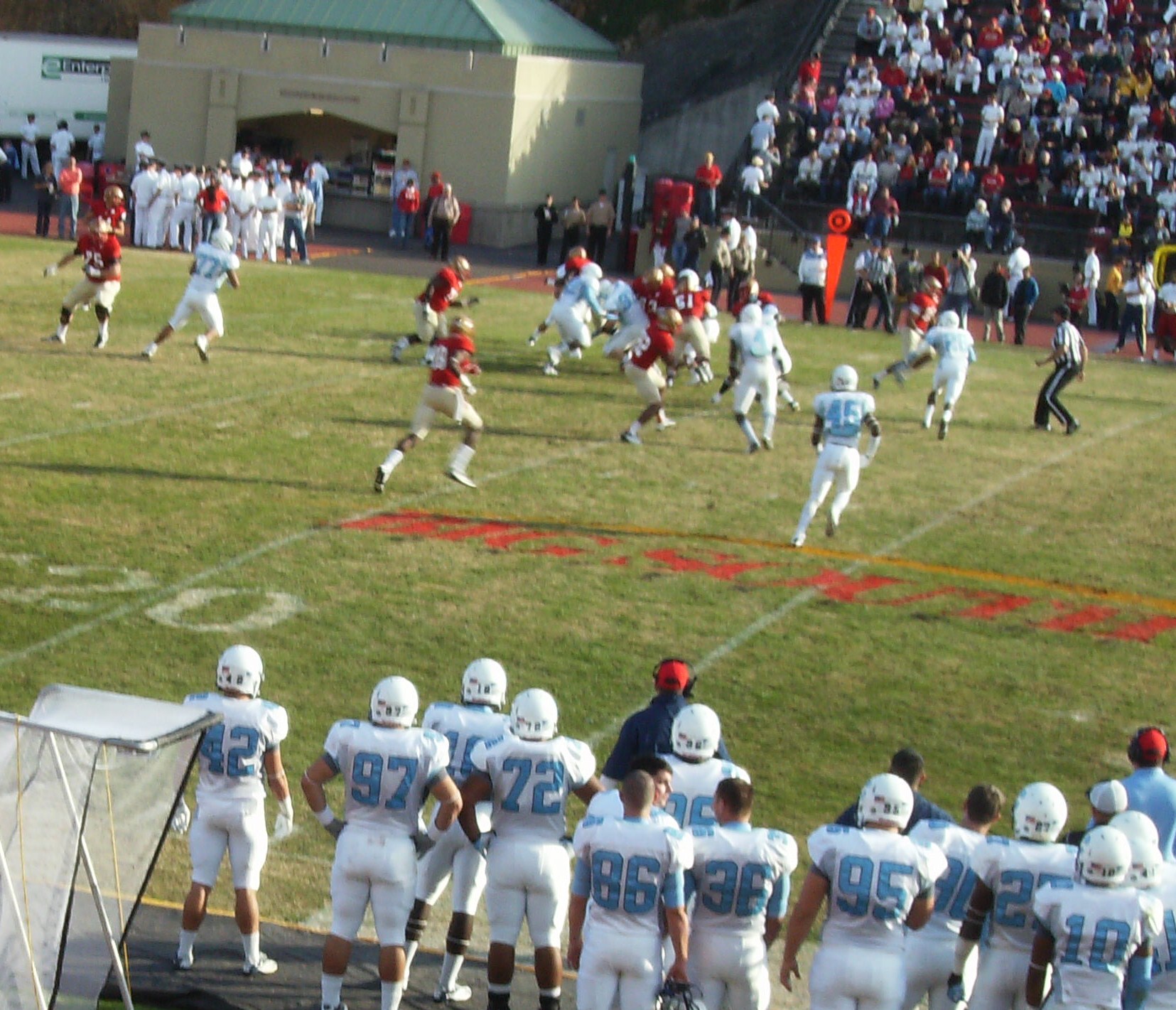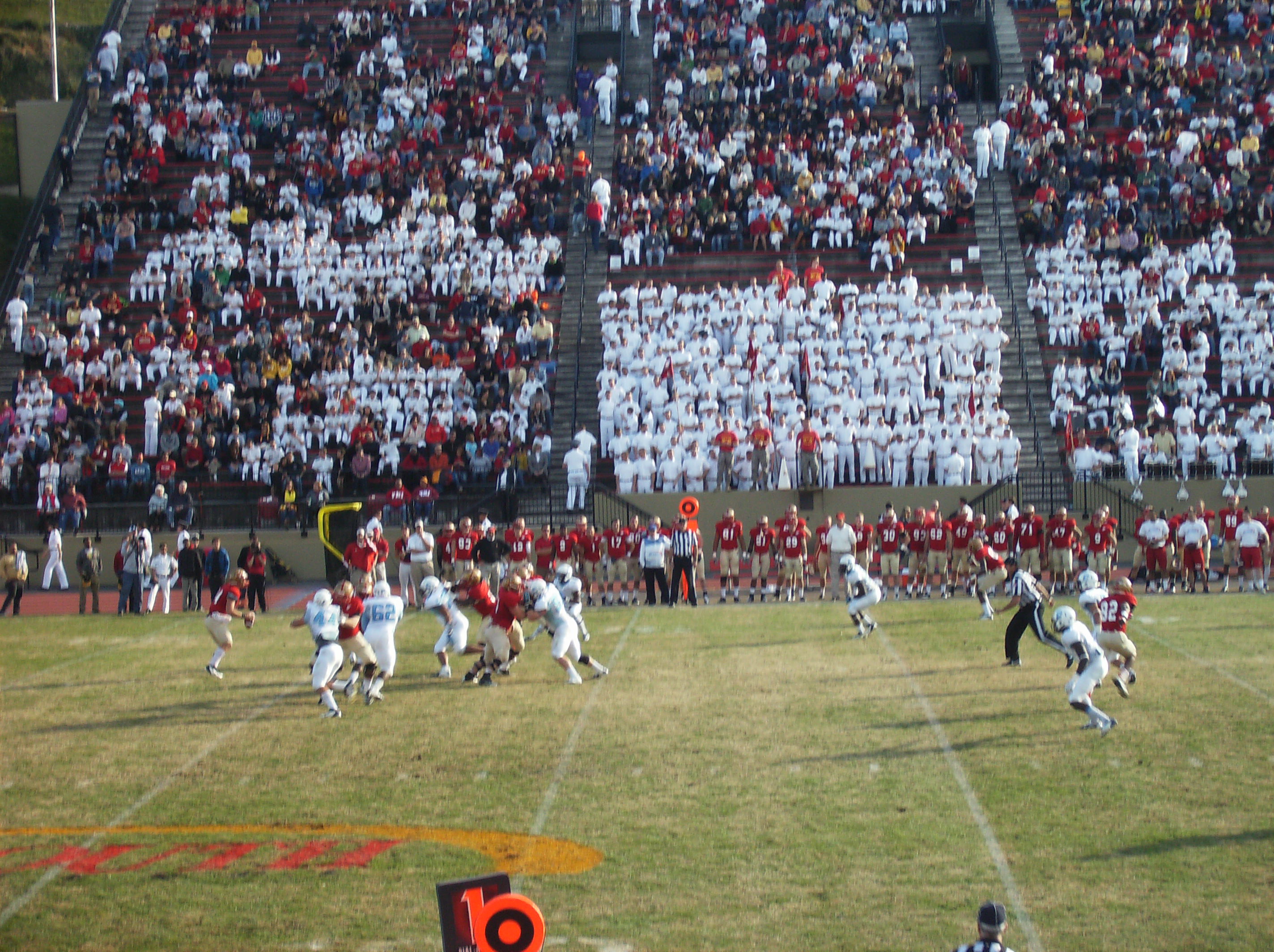 The home side was mostly full too, a tribute to a very loyal VMI fan base. Some of those same fans traveled to Charleston for last year’s game between the two teams. They were part of arguably the most impressive (on a per capita basis, at least) group of visiting supporters, especially striking given VMI’s way-too-long stretch of gridiron futility.