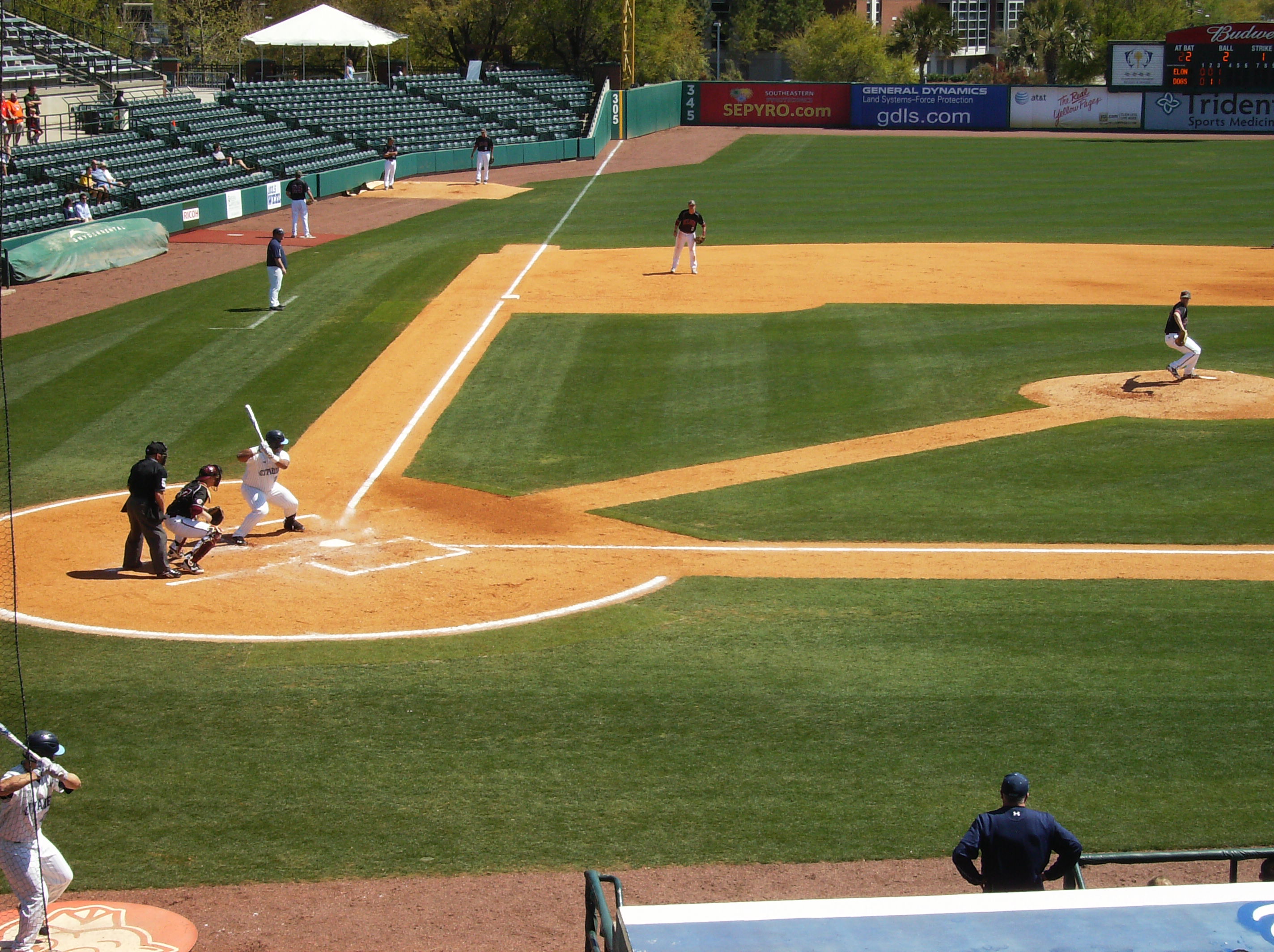 Bo Thompson waits for the pitch as Tyler Griffin and Fred Jordan look on.