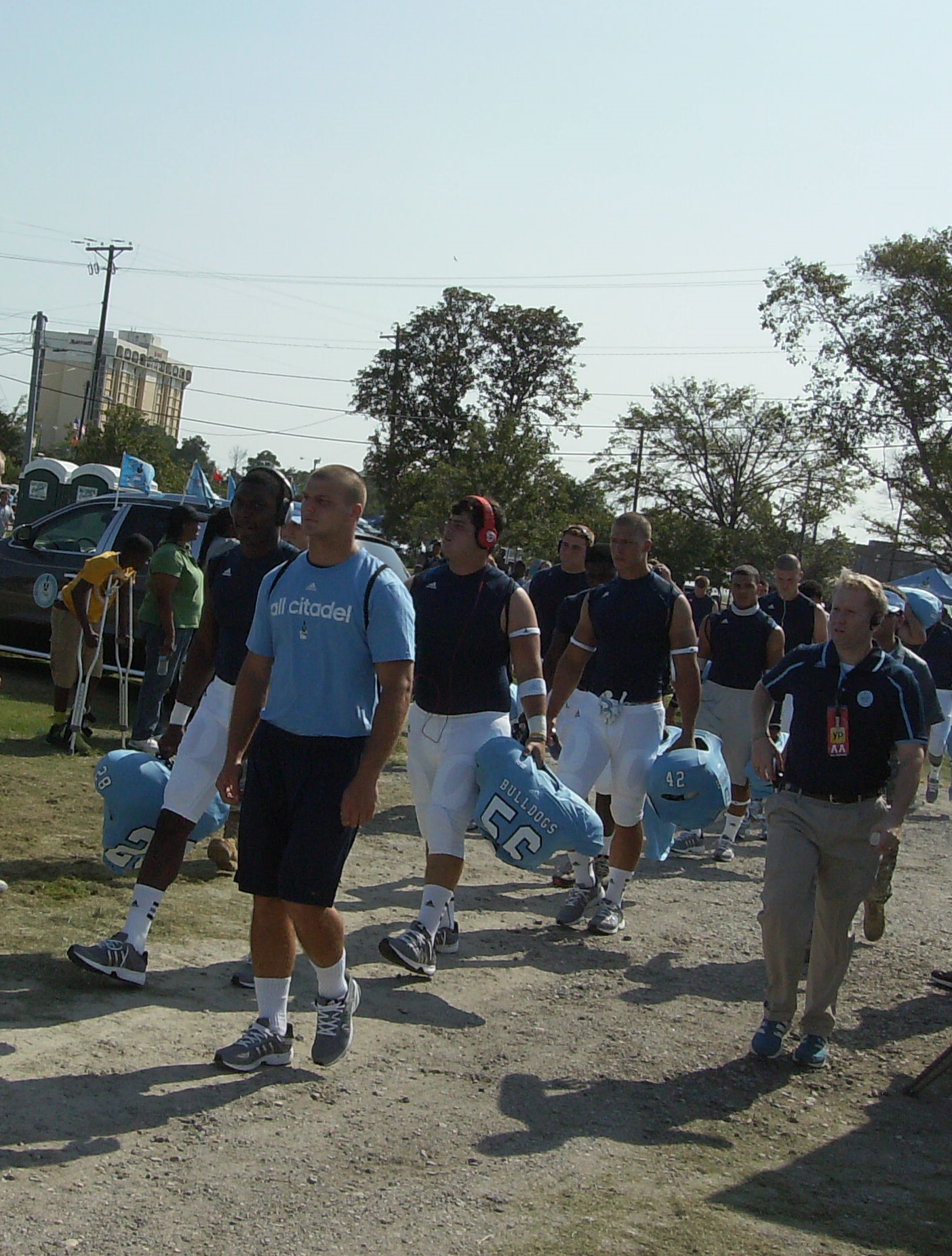 A player not dressed out for the game is wearing a new adidas t-shirt, one that unfortunately gets the name of the school wrong.