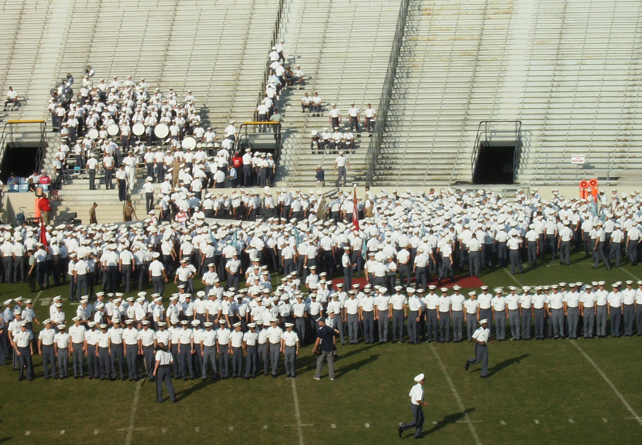 The freshmen begin to form the “Block C”, while the upperclassmen enter the stands.