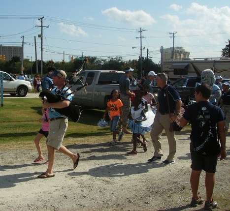 The bagpiper, the coach, and Spike, along with some friends.