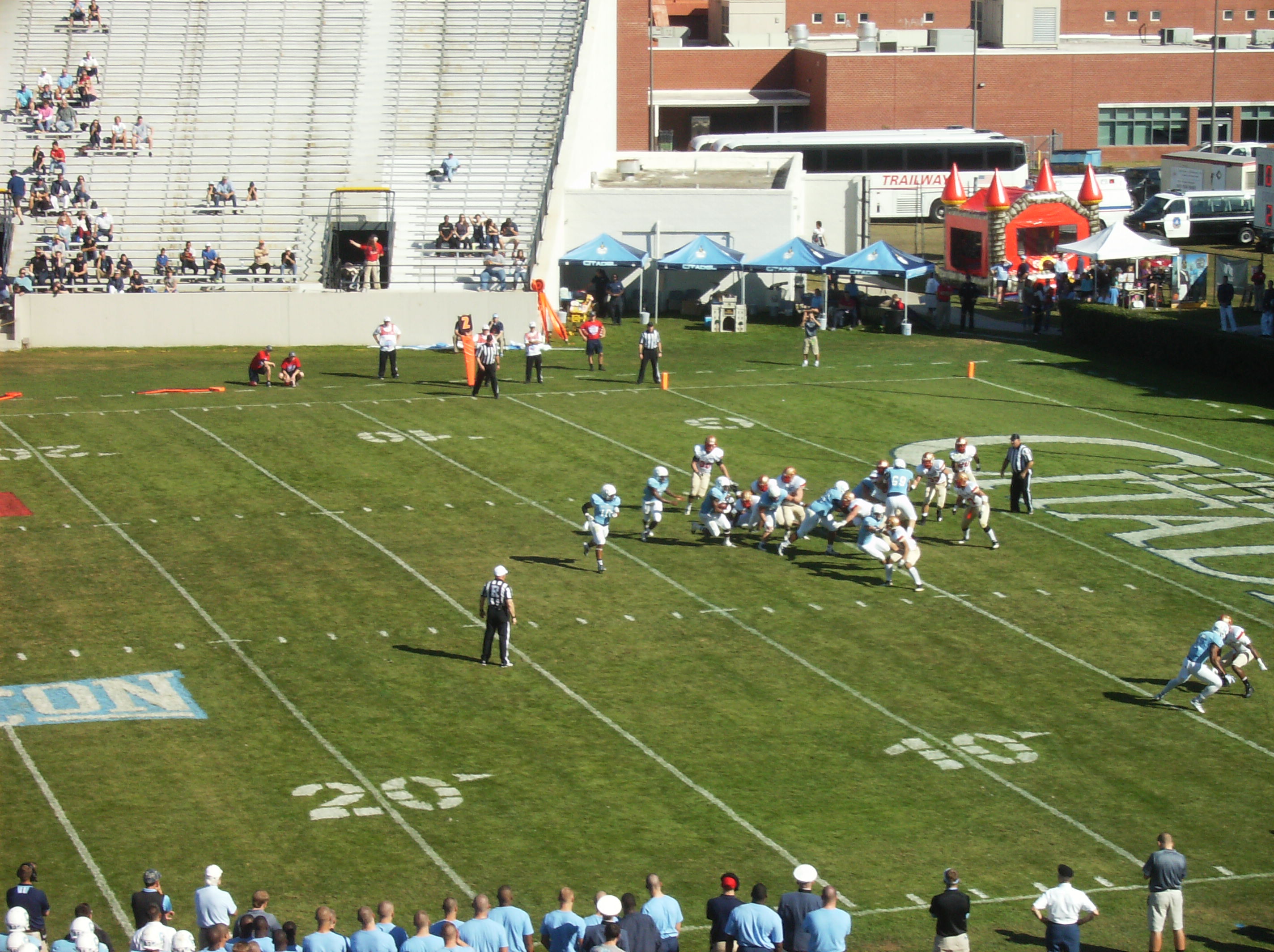 Darien Robinson carries the ball for no gain, stopped by the Keydets’ Conner Mays and Logan Staib.