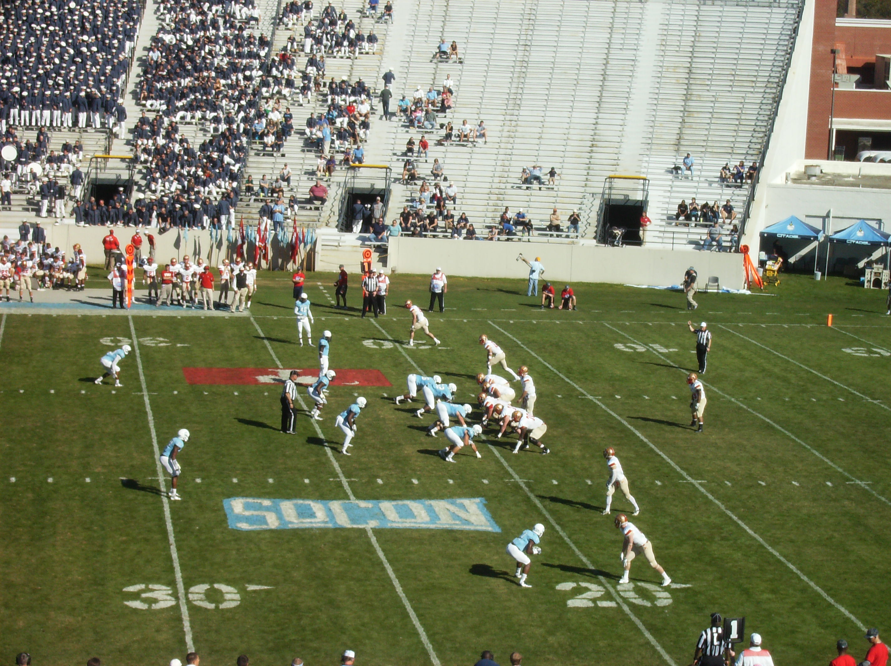 Before the snap, A.J. Augustine surveys the field. The play resulted in an incomplete pass.