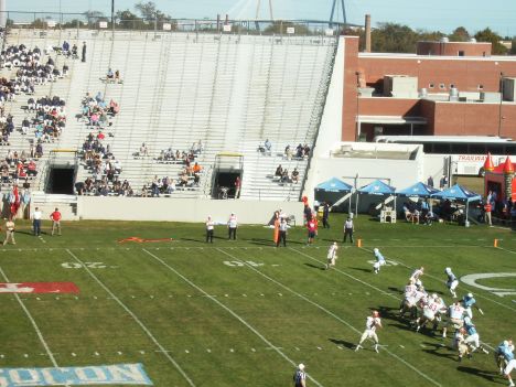 A.J. Augustine prepares to throw, but never gets the opportunity, as the onrushing Ian Thompson sacks him.