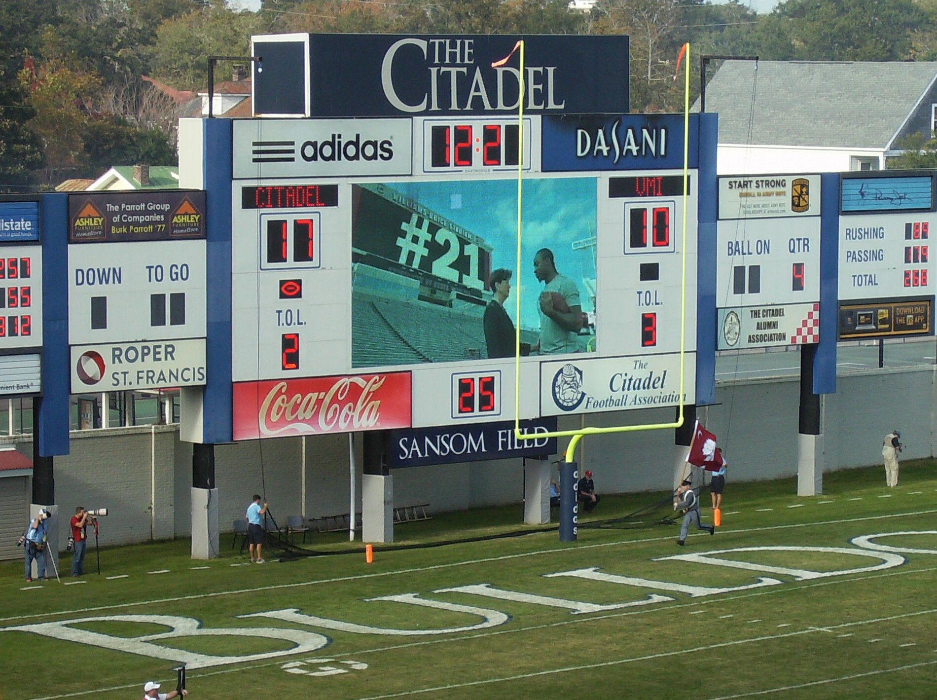 A member of the Touchdown Cannon Crew runs through the back of the end zone with the flag. He would repeat this several times.