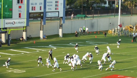 Darius Morehead rushes for one yard, tackled by Tevin Floyd and Travis Johnson.