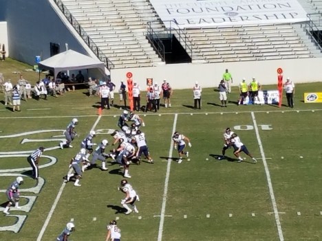 Jajuan Stinson is stopped for no gain by Tevin Floyd and Jonathan King.