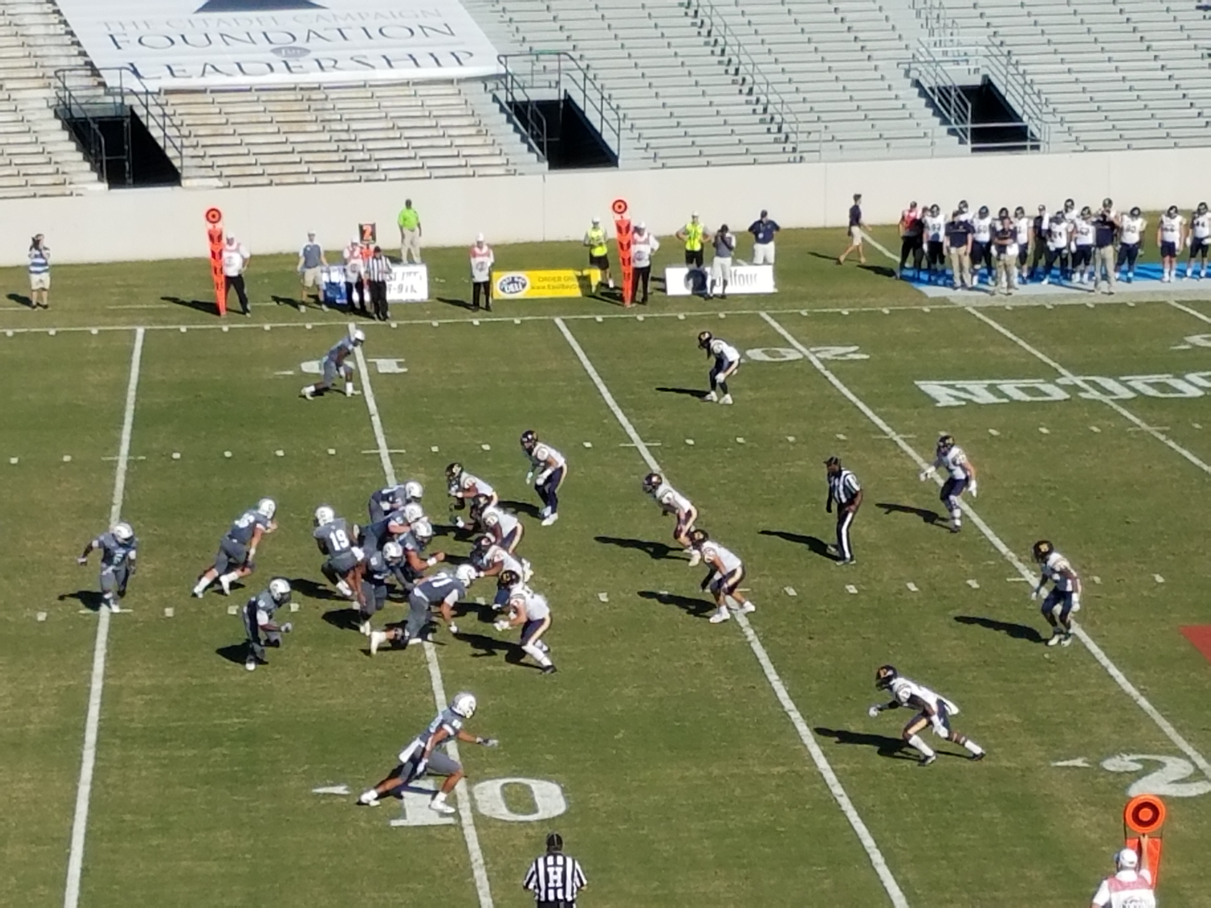 The Citadel’s Reggie Williams took the pitch and gained one yard. Trey Quillan made the tackle.