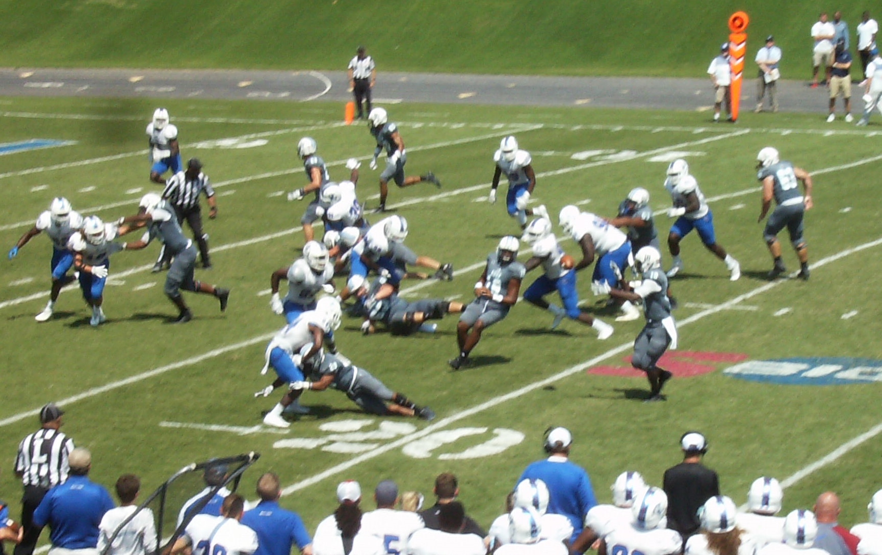 Cam Jackson takes the pitch and loses a yard. The Citadel is also called for a penalty on this play, setting up first-and-24.