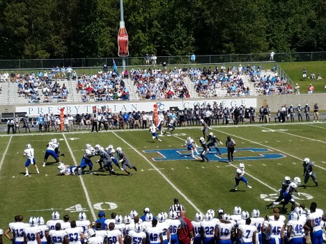 PC’s pass is complete for a first down, the play gaining 13 yards. Tyus Carter made the stop for the Bulldogs.