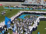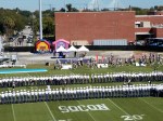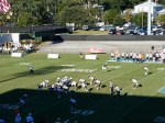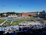 The blue-clad cadets spread out in front of the stands in regiment [order] and gave cheers for The Citadel team. All the while hundreds of mere civilians were swarming into the seats on four sides of the field. As soon as the cadets were seated they began their songs and cheers.